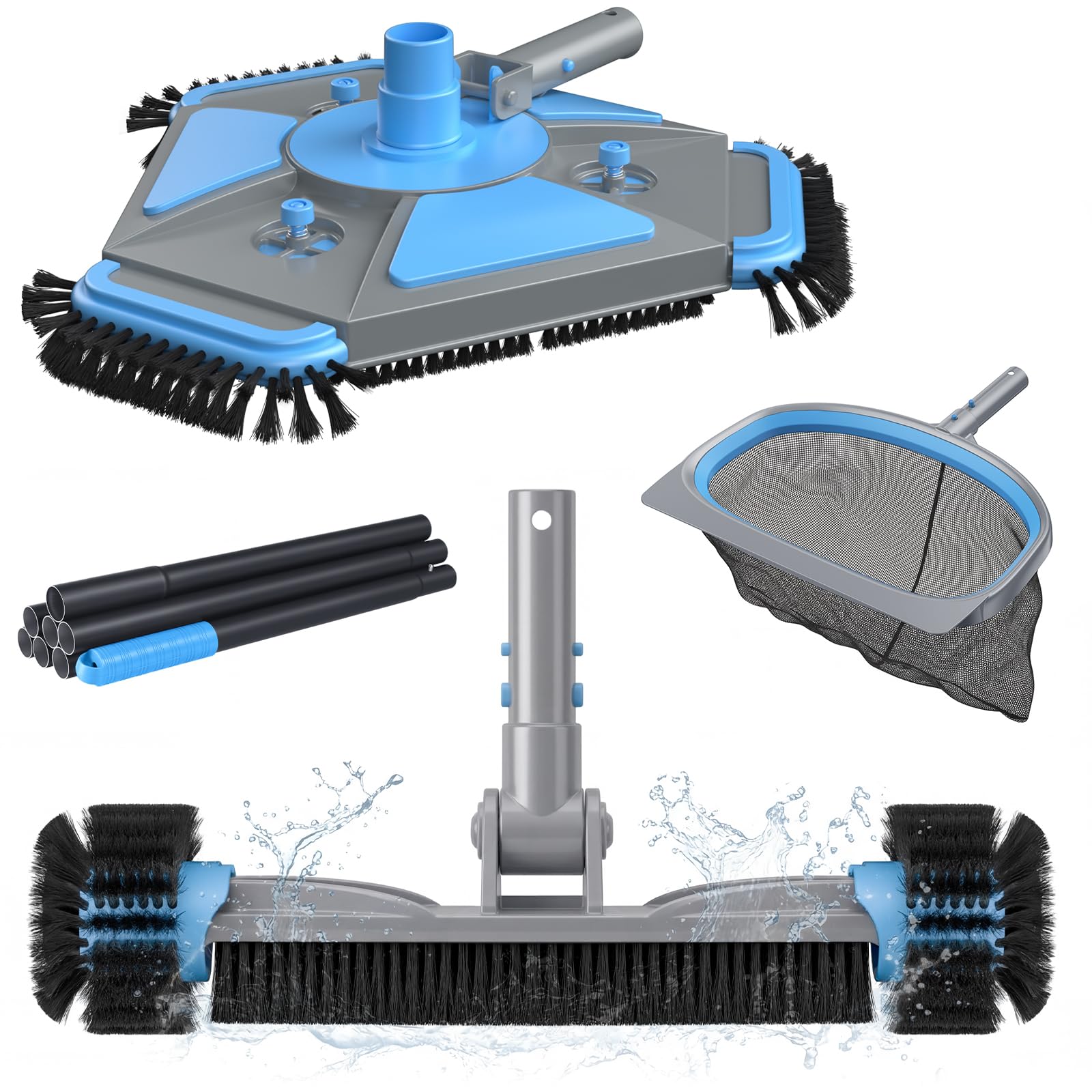 UIRWAY 4-in-1 Deluxe Swimming Pool Cleaning Kit – Includes Upgrade Triangular Pool Vacuum Head, Detachable Brush, Deep Leaf Skimmer Net, Adjustable Aluminum Pole Inground & Above Ground Pools