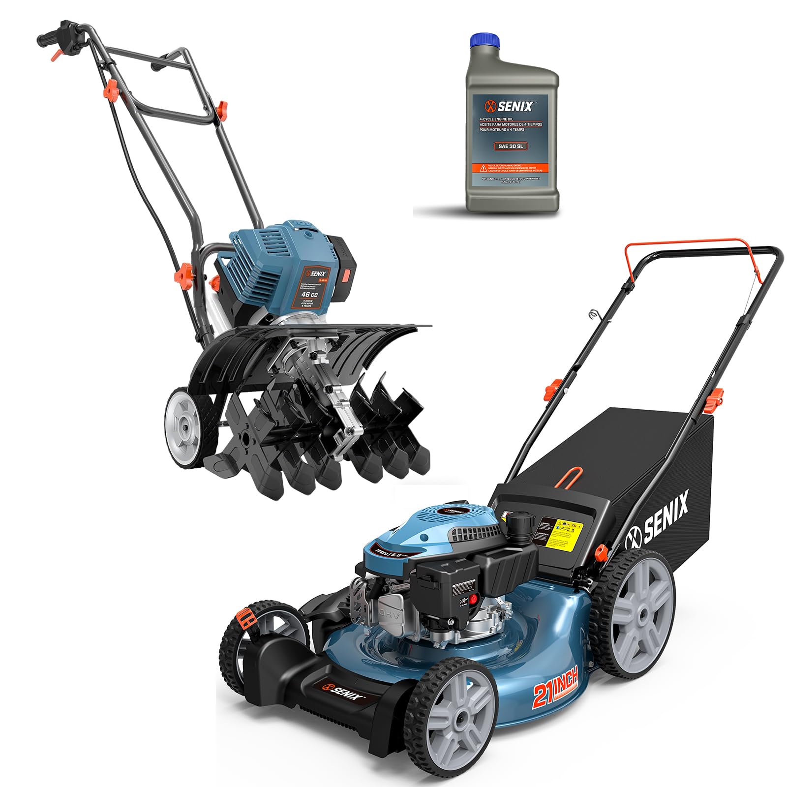 SENIX LSPG-M14 21-inch 144cc Gas Lawn Mower, 46cc 15-inch Gas Powered Tiller Cultivator Kit