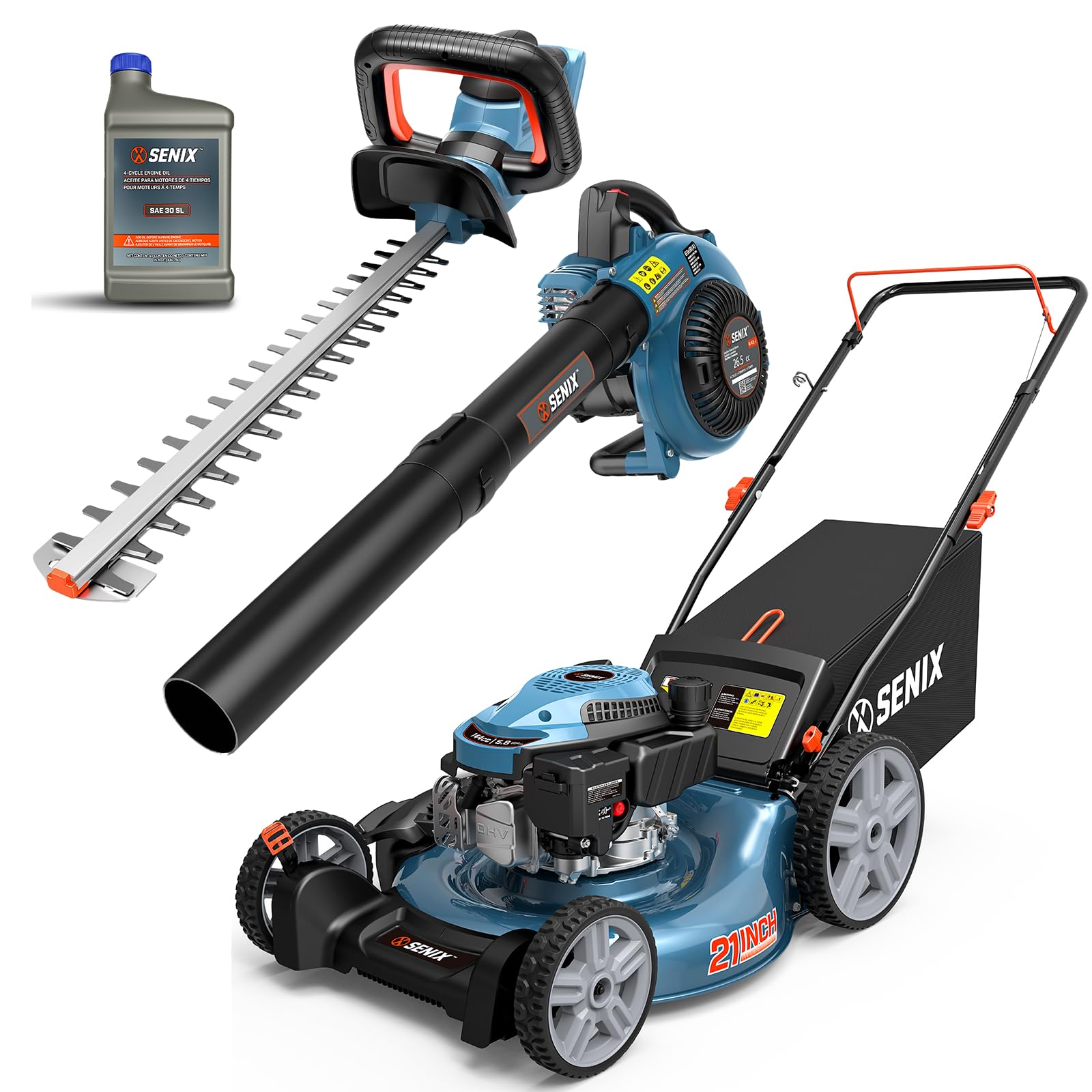 SENIX LSPG-M14 21-inch 144cc Push Lawn Mower Gas, 26.5 cc Hedge Trimmer and 4-Cycle Leaf Blower Kit