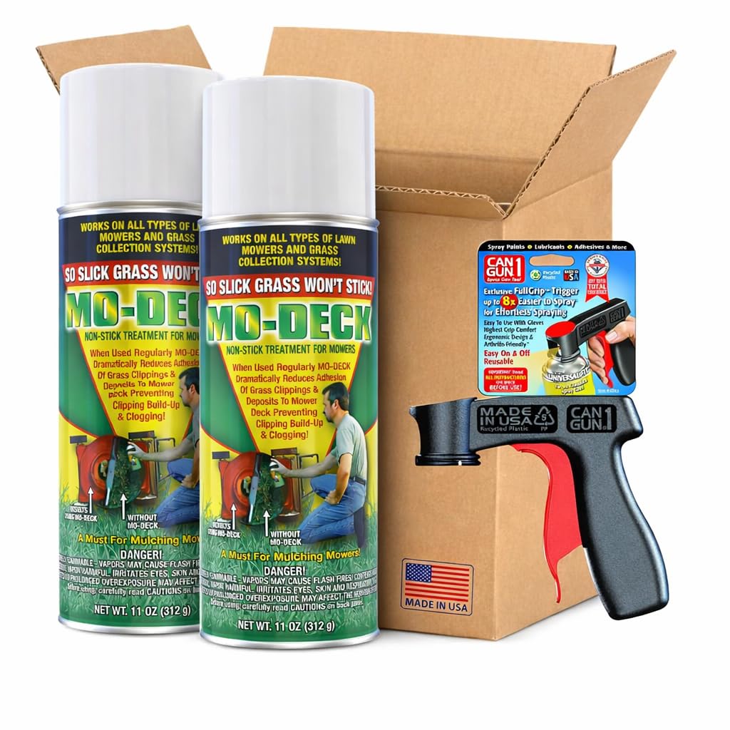 Mo-Deck Non-Stick Grass Repellent Spray (2-Pack with CanGun1) Made in USA Lawn Mower Deck Spray for Blades, Decks, Trimmers & Hedge Trimmers – Prevents Grass Buildup, Rust & Clogging Universal Fit
