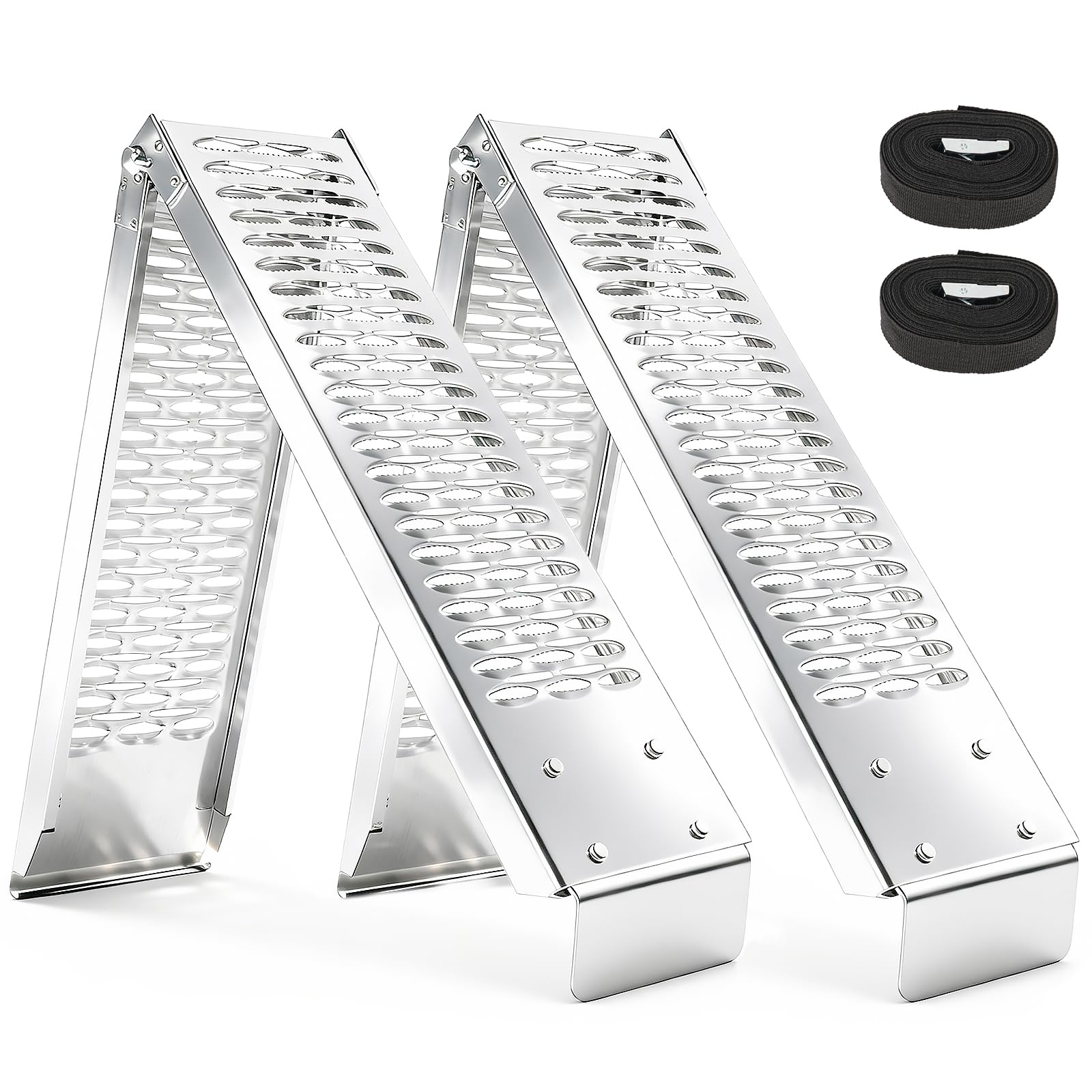 Industrial-grade punch-plate surface provides superior 360-degree traction in wet or muddy conditions. Shorter length (approx. 36″) makes them unsuitable for loading into high-clearance pickup trucks.