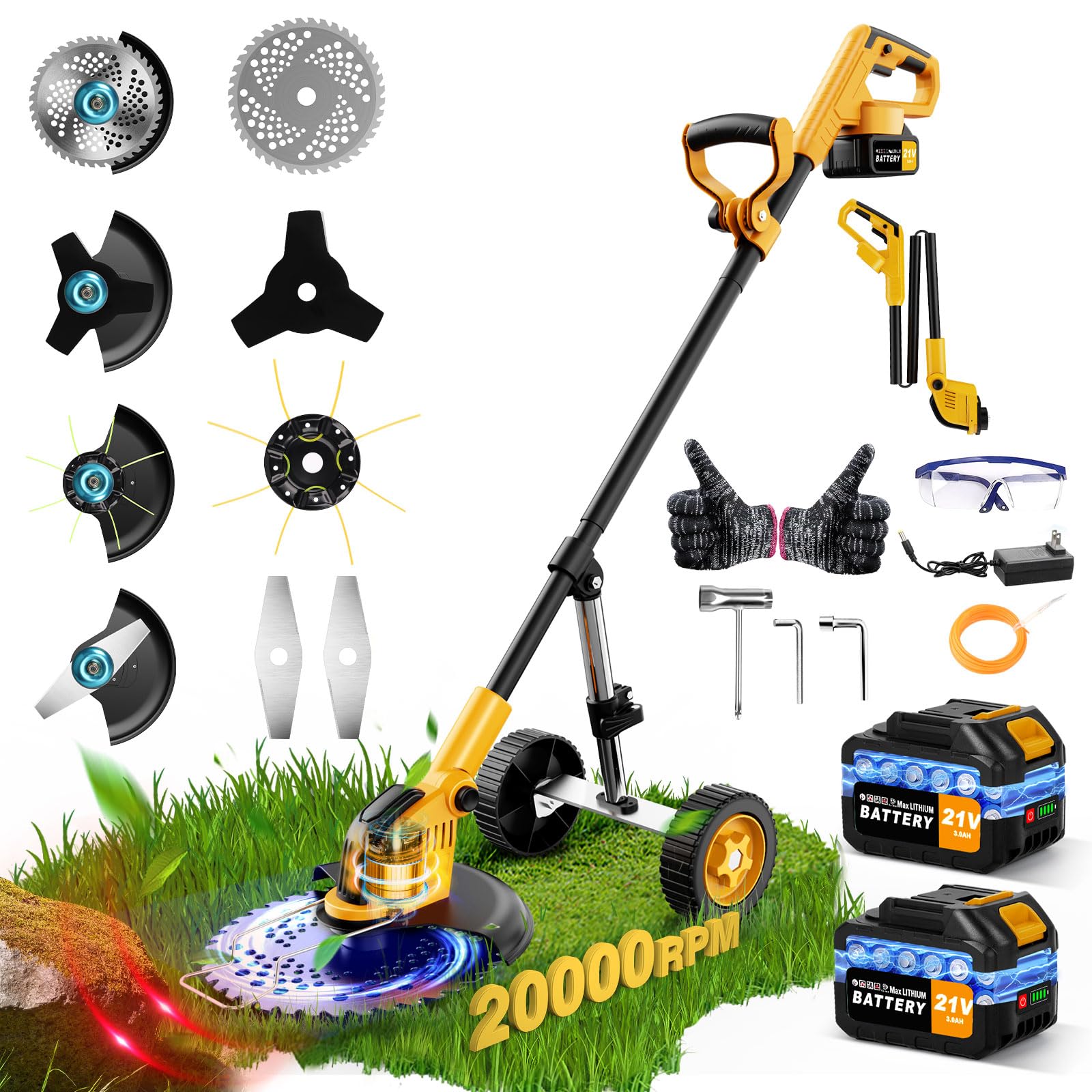 RPM Battery Weed Wacker Cordless, 6000mAh Electric Weed Eater Battery Powered, Heavy Duty Brush Cutter Edger Lawn Tool/Weed Trimmer/Grass Trimmer W/Wheel Metal Blade, 2 Battery Yard Tool