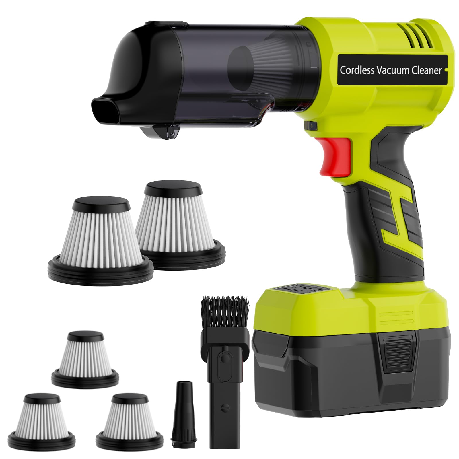 Spot cleaning in cars, upholstery, and workshops where portability and ONE+ battery compatibility are key, ideal for Ryobi ecosystem users tackling fine dust, pet hair, and light spills without lugging a full upright.