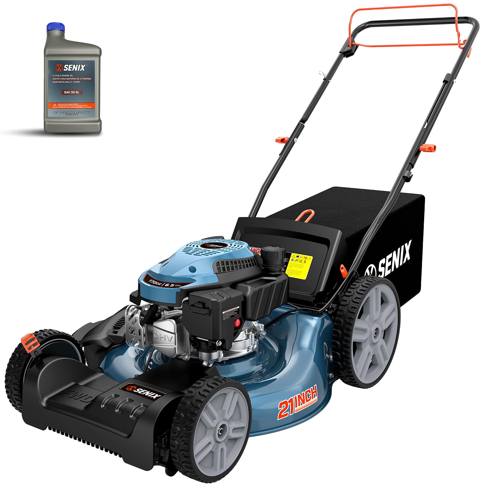 SENIX 21'' Self-Propelled Gas Lawn Mower (FWD), 170 cc 4-Cycle Engine 3.8 HP, 3-in-1 (Bagging/Mulching/Side Discharge), 6-Position Cutting Height Adjustment, 1.7 Bushels Grass Bag