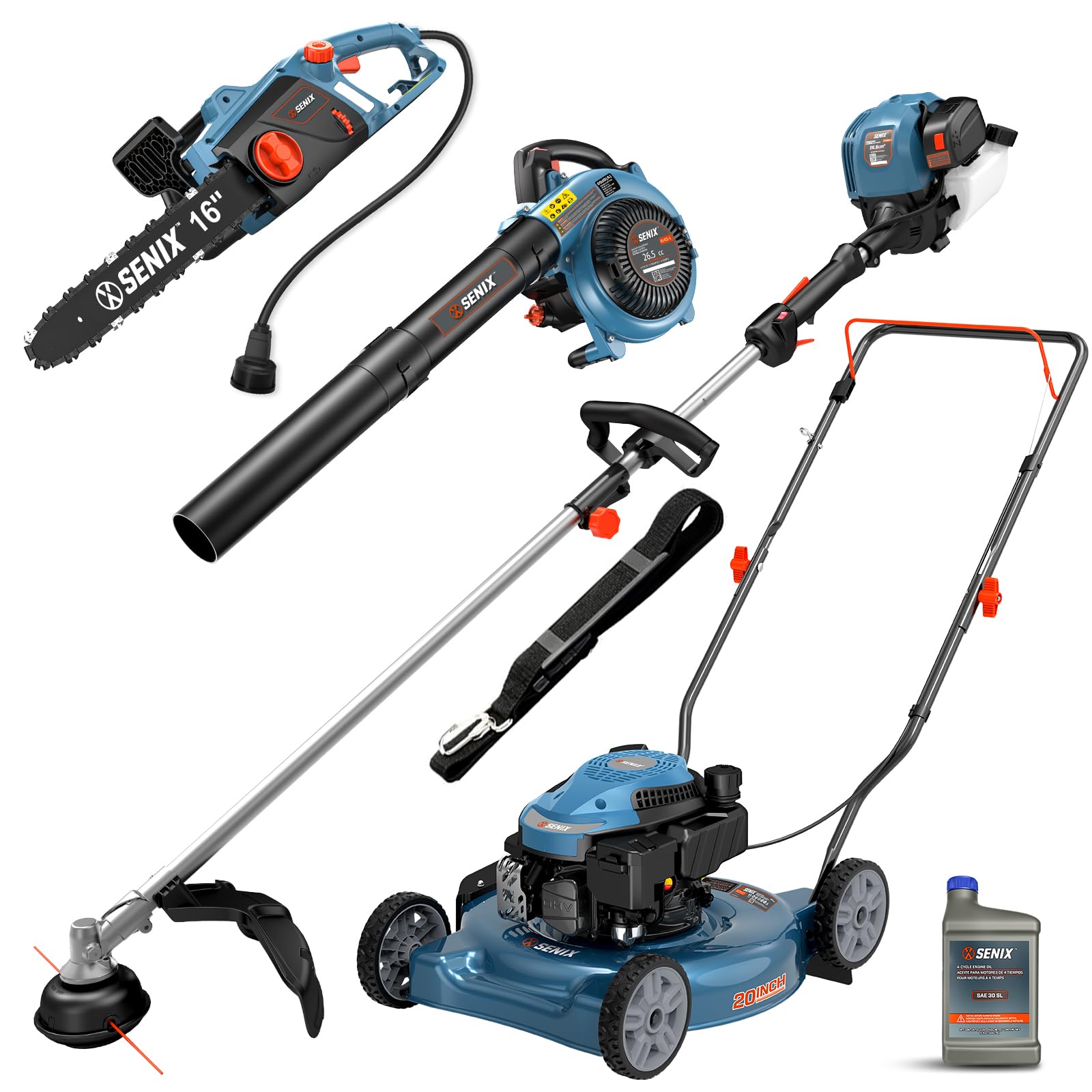 SENIX 17-Inch 26.5 cc Gas Weed Wacker, 20-Inch 144 cc 4-Cycle Gas Lawn Mower, 26.5cc Gas Leaf Blower and 16" Corded Chainsaw Kit