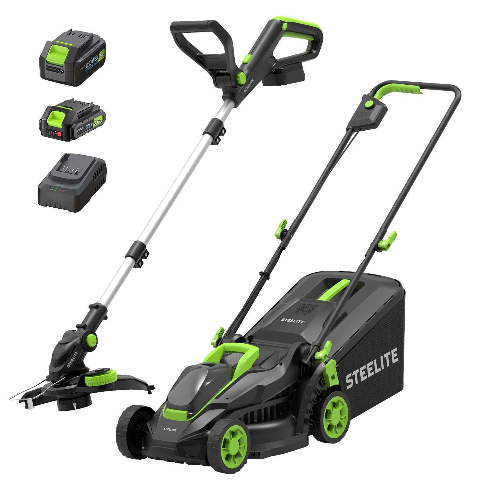 STEELITE 21V Brushless Electric 13 inch Cordless Lawn Mower and String Trimmer Combo, Yard Tool Kit with 4.0Ah + 2.0Ah Batteries & Charger, Mulching/Bagging Push Mower & Blower for Small Yards