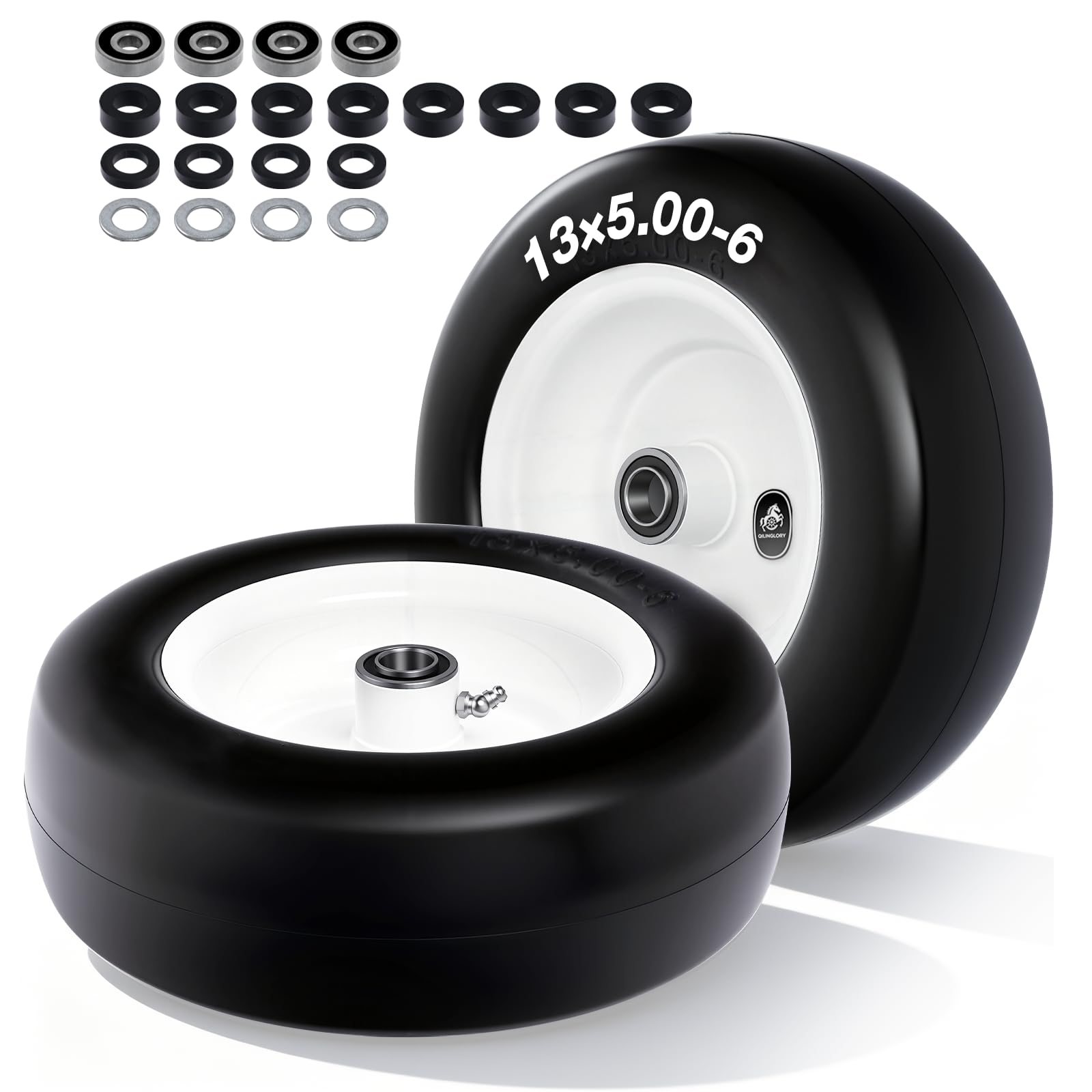 x5.00-6 Flat Free Lawn Mower Tire and Wheel with 3/4″ bearing bore, with 5/8” Extra Bearings & Adjustable Spacers, for Riding Mower, Lawn Tractor, 500 lbs Capacity, 2-Pack