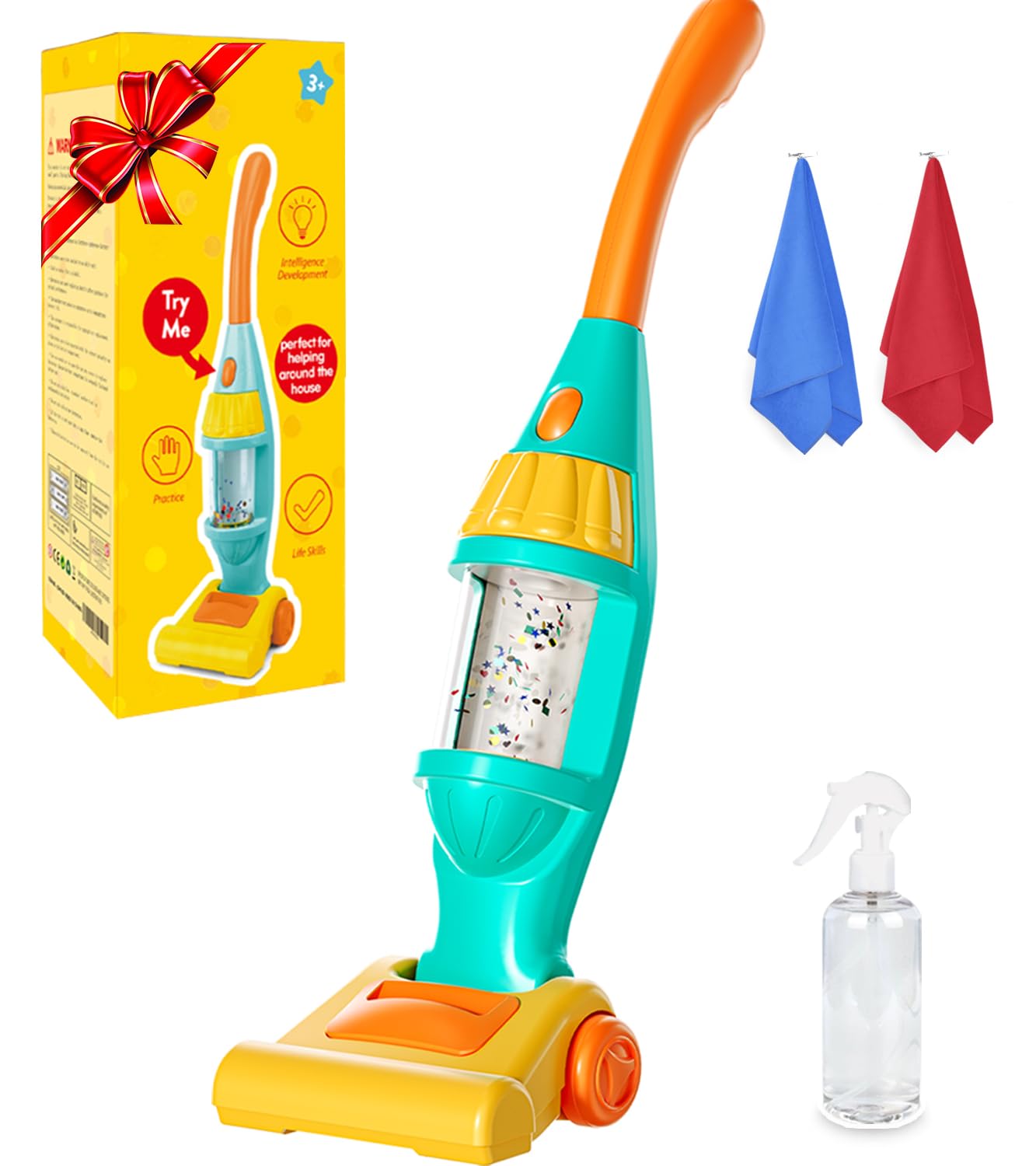 Toddler Vacuum Toy That Works with Lights & Sounds, Pretend Play Toy Vacuum for Toddlers 3-5 Years Old, Baby Vacuum for Boys Girls, Kids Vacuum Cleaner Cleaning Toys with Spray Bottle, 2 Towels